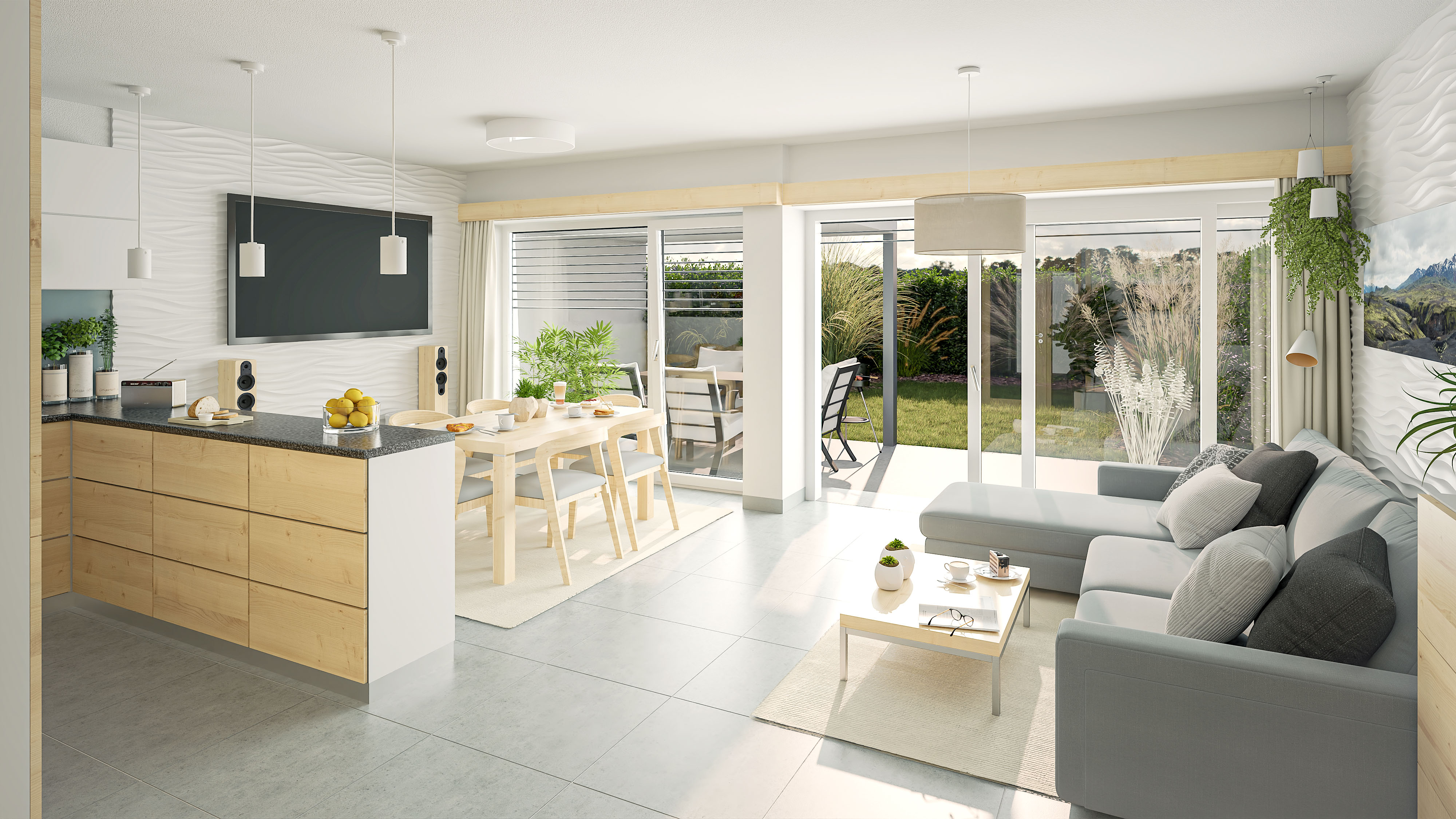 V 1. NP bude obývací pokoj 17,00 m2, kuchyňský kout 6,93 m2, jídelna 8,74 m2, zádveří, hala, sklad a WC.