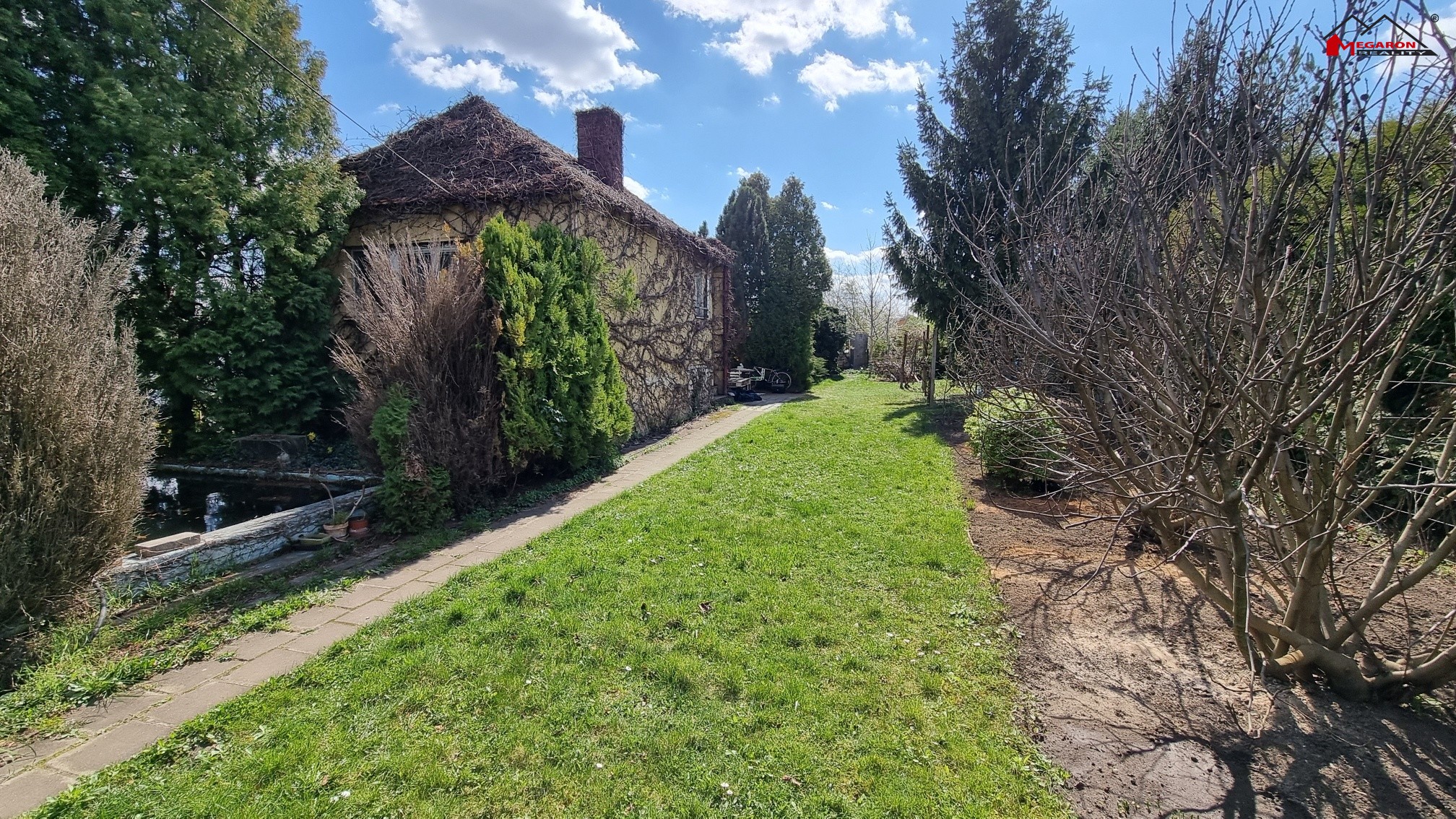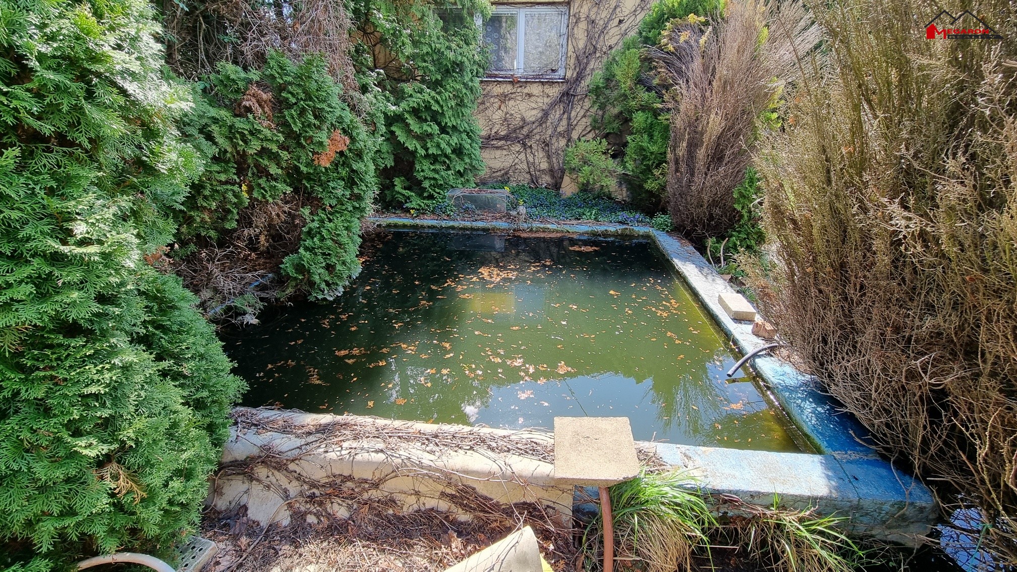 Zahrada se zděnou chatou a menším bazénem, na pozemku o výměře 1373 m2 je několik ovocných stromů a vinná réva.